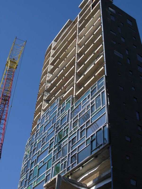 Because the lines of fragmentation, load path slab to slab is not continuous. Steel is the structure of the facade, as the nonlinear load paths and massive panels have conspired to make an aluminum structure too large to be attractive inside the apartments. All elements of steel, 3 inches wide, are based on the same plane, but vary in depth. The steel frame, which is visible from inside the apartment, consists of steel plates cut with laser welded together, then pass a process of sandblasting and painted silver.