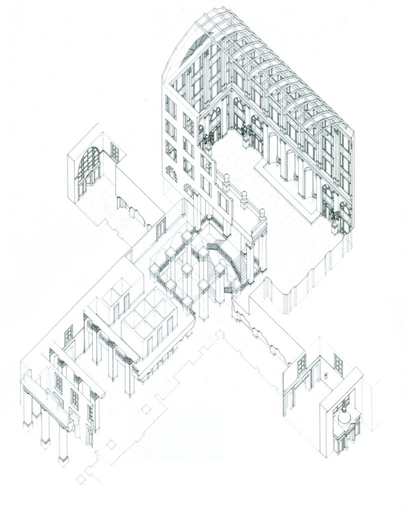 Along Boylston Street, a continuous row of shops is interrupted at one point by another entrance leading to the gallery pedestrian crossing the street from north to south. To emphasize the public nature of the gallery and the conservatory, from Boylston Street entrance is flanked by pairs of Ionic columns and a revolving door at a shrine.