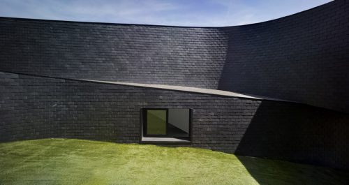 A black construction outside, absorbing, slate, a site-specific material, aesthetic regulations imposed in the area. Inside white, reflective, generic, neutral, and bright metalwork and transparent railing. Life incorporates color outside and inside the vegetation with people.