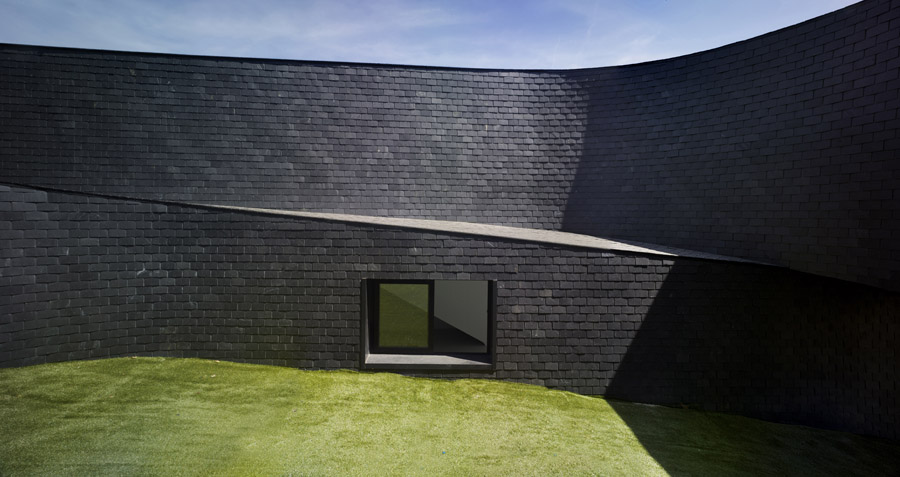 Extreme figure, the house curve to generate the largest amount of linear feet to the good views, Acodal in the landscape and back on itself by completing the turn. A row of windows on the east side offers a panoramic view of the nearby mountains. The degree of intimacy grows with increasing distance from the ends. At the midpoint, a media, isolated, completely dark. Technology 100%, 0% landscape.