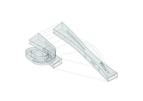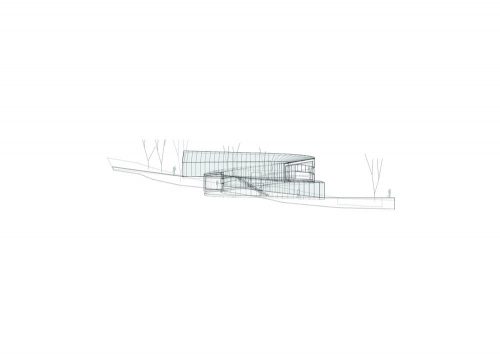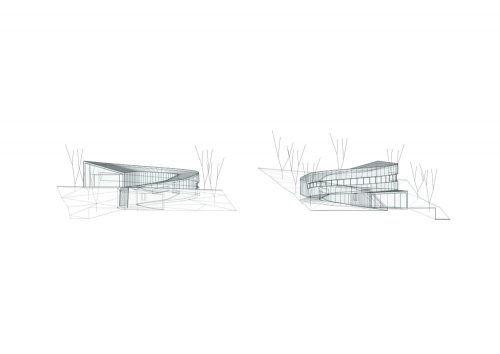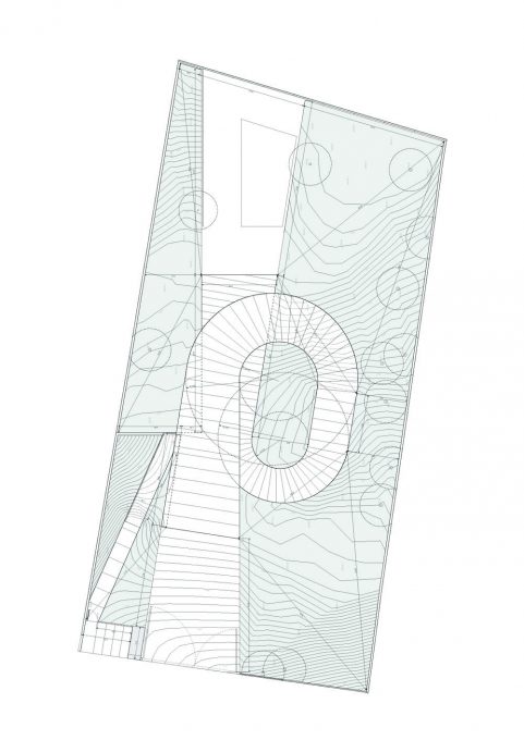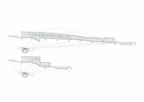 With a single gesture generates two ways to move, down and look outside. The long house, a sinuous, a drop in ramp, large turning radius tangent to the setbacks of the parcel generate an overview. The house short shortcut straight, direct reduction step and look deep into the landscape.