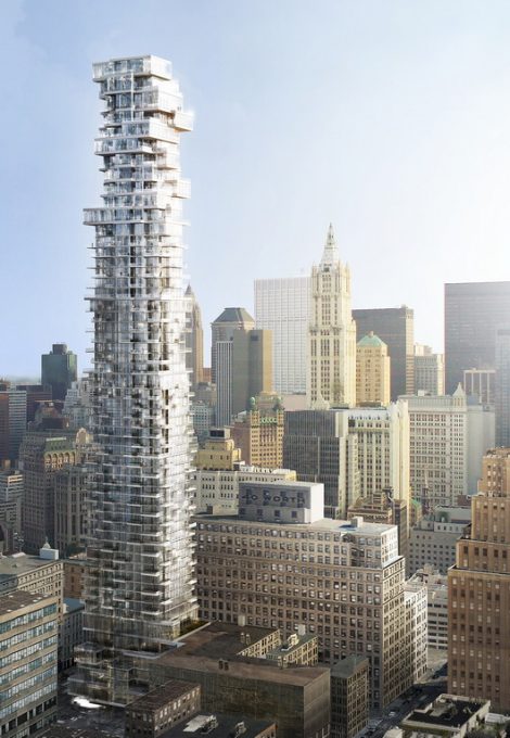 The cantilevers that make up the building offer a jagged silhouette that can be seen for miles around, even in the midst of the large buildings that make up the Tribeca district in Manhattan.