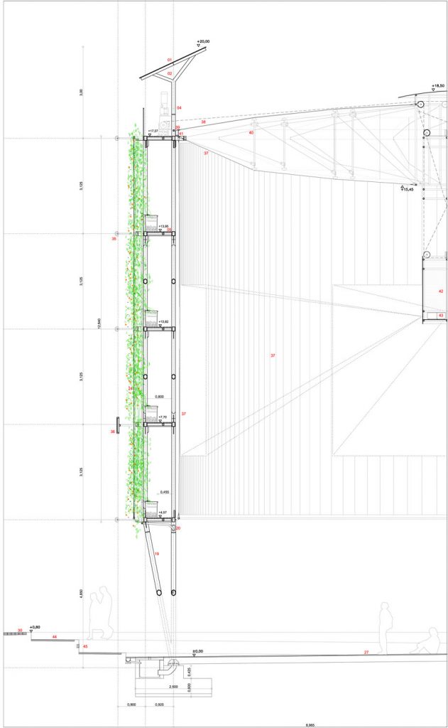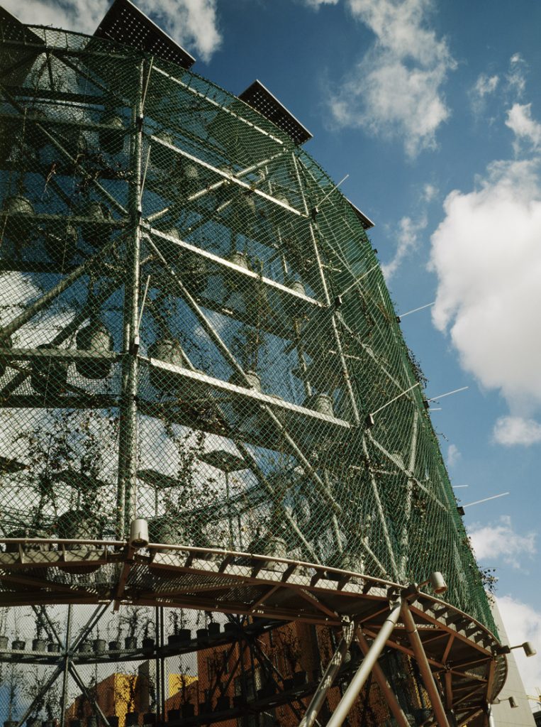 Each of the cylinders is four meters high from the ground, has a height above ground of about twenty meters outside diameter and a radius of twenty-nine inside. It consists of metal scaffolding that supports five ferrywomen overlapping polygons. Ferrywomen are exclusive to the maintenance and contain boxes with climbing plants which should cover the inner facing the central courtyard. The facing wall of the cylinder is formed by a sequence of sixteen vertical tubular conduits.