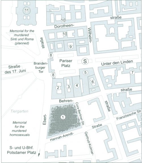 The monument is implanted in an extensive grounds in the historic city center of Berlin,Germany. It is bounded by Ebertstrabe, Behrenstrabe, Cora Berliner Strasse and Hannah Arendt Strabe between Potsdamer Platz and the Reichstag, the German Parliament building with the famous dome by Sir Norman Foster.
