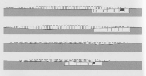 Each block is 238 cm wide and 95cm long and have been placed in tight rows. Their heights range from ground level and 4.5m at the center of the monument. Each slab has been lifted on their own foundations and can be tilted up to 2 in different directions. The first floor is tilted in one direction and then another, leaving a 95cm wide corridor between blocks, enough to pass a wheelchair or one person, not two, the intention is that each visitor individually living space.