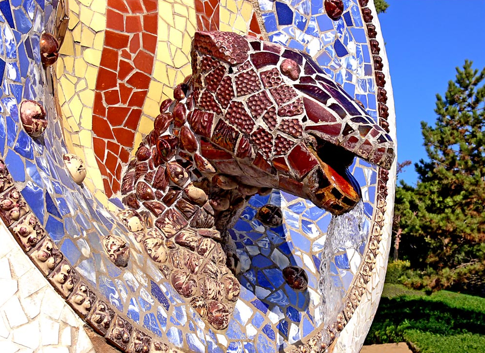 In the central space between the two sections are located three fountains and sculptures representative of Catalonia: the French side to the north and south the Spanish side. This first source is a circle that symbolizes the world, along with a compass symbolizing the task of the architect. In the second of which appears the shield of Catalonia and a snake, some say that is because the symbolism of the medicine, and others refer their presence in a religious sense. And finally, the third source is the main protagonist of the park: a colorful salamander sits looking straight ahead and access to the city. This building appears to be almost like a dragon, is the subject of comparisons as well as mythological believes he can represent the element of fire. Also, this animal is present in the arms of the city of Nimes, where Gaudí was raised. And while it is a remarkable aesthetic quality, which serves a more important: when the underground reservoir and water can not accumulate more, the surplus is expelled through the mouth of the dragon out.