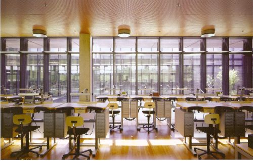 In indoor environments, defined by large planes of glass, metal and wood, everything seems to be suspended in space, since the equipment is incorporated into the overall design and gaps are cut by the stairs. A large glass atrium, three stories high, is surrounded by halls, galleries and staircases which also dominated the glass, evoking the subtlety of a clock and tiny, precise parts.