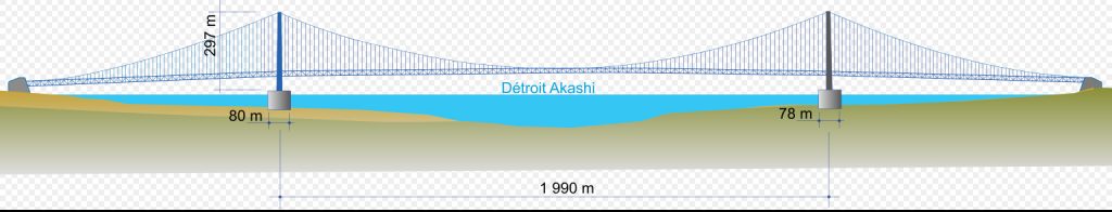 The Akashi-Kaikyo suspension bridge has a length of 3,911 m and three bays. The central section, between the main towers is 1,991 m and the other two 960 m each. The height of the main towers is 282.8m above the water, 297,30m until the end of the anchors, the structure is submerged 60m below the water level. Originally the central span was designed to measure 1.990m, but the Great Hanshin Earthquake, the January 17, 1995, moved the 1m towers, so far the only thing that was up. The new distance is incorporated into the design.