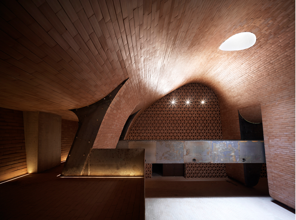 At the bottom lies the bottling and warehouse, is protected heart of the winery, where the wine ages in barrels, captures the diffuse dark and rhythmic sequence terracotta vaults, the sacred dimension of a hidden space that creates optimal conditions thermohygrometric in the slow process of product realization. Reading the architectural section of the building as the joint evidence altimetry is the way to production, by gravity, of grapes, from arrival at the fermentation tanks to the cellar where the casks. This route is the reverse by visitors, which from the parking elevator up to the winery and vineyards, through the production and exhibition areas, ranging from the mill to the wine bar and restaurant, located in the same plant that houses the auditorium, a museum, a library, tasting rooms and the possibility of buying direct.