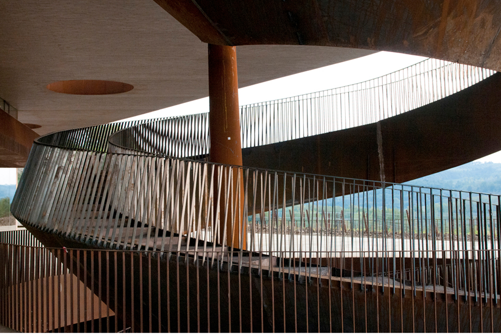 Used mostly in circular forms, such as the impressive spiral staircase from the entrance, a masterpiece of technology. Also takes center stage in the forward curves partially covering the terrace or in the shields of internal stairs.