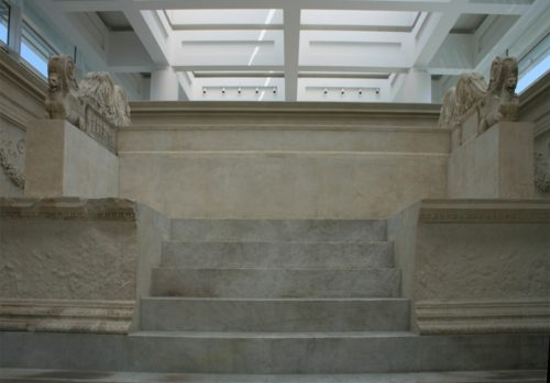 The monument consists of a rectangular, not covered, with dimensions of 11.65 x 10.62 x 4.60 meters, made of Carrara marble. The room has two doors, one in front, facing east and originally preceded by a staircase, by which the priest and another came back, facing west, for animals to sacrifice. In the center stands the “Ara”, the altar itself, seated on a stepped pedestal. Inside encumbered with a frieze of garlands and bucráneos decorates the top of the walls, while outside sockets are covered with acanthus scrolls. The exterior friezes are decorated differently depending on their location, flanking the doors four allegories, and side walls two processions.