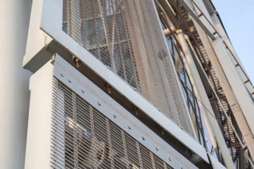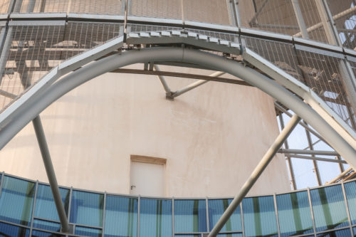 The exterior of the building is covered by a mesh of steel DOGLA-TRIO 101, which, during the Asian Games, was festively lit by glittering LED lights. This fabric has a horizontal distance between the wires that varies between 14 and 44 mm. This increases the open surface area from 72% to around 85%. The increased surface open at the top of the tower makes possible the transparency of the mesh to the observer, even with extreme visual angles of up to 5 degrees at the foot of the tower.