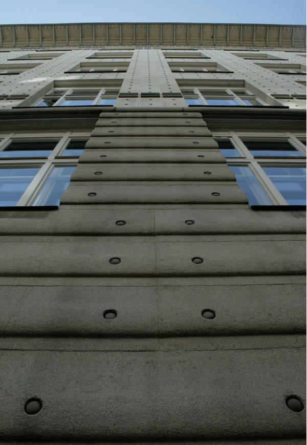 The facade gives the building grid a particular aspect that has received numerous and varied comments. Architecture critic said about J.Lux made ​​”… the building resembles a huge safe, covered entirely by nailheads. However it is not devoid of a certain monumentality and character whatsoever, for the interior and spread outward objective directly and clearly the idea of ​​building….. ”