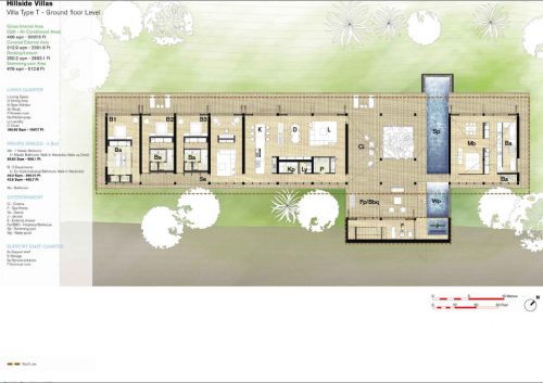 The corridor is divided into 8 modules, including 6 which are the major functional spaces above and 2 smaller spaces that serve as transition. These modules transition between the bedrooms and the areas of daytime activities, one does this through a landscaped courtyard, which ends with a jacuzzi and the other hosting access to a pool of water that communicates well with outdoor pools.