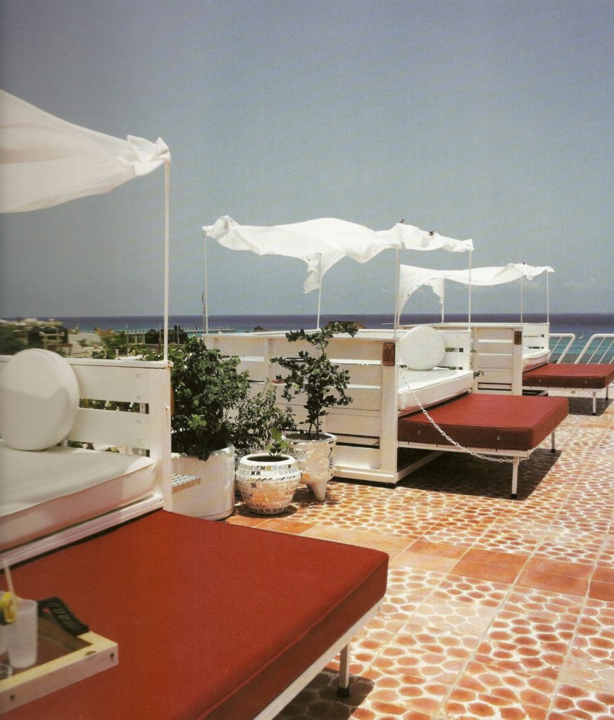 The rooms offer an atmosphere of urban beach with inflatable inner tubes hanging from the white concrete walls. Some rooms have wooden tool boxes that replace the traditional bedside. Tool chests are opened and provide ashtrays, Polaroid rolls for white cameras are on the beds and remote control flat screen televisions. The rooms have heavy wooden doors with latches clear arc, behind which lies the bathroom. The bathrooms are small disco balls connected to a string that functions as a release mechanism. The bath and toilet are all in the space of the room.