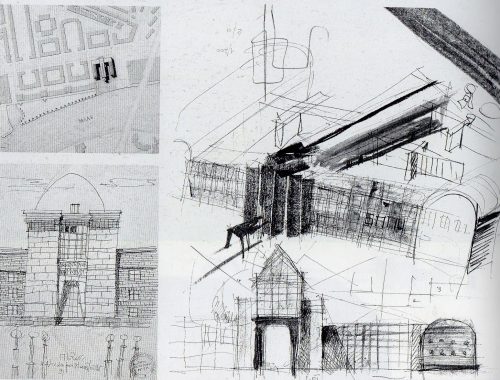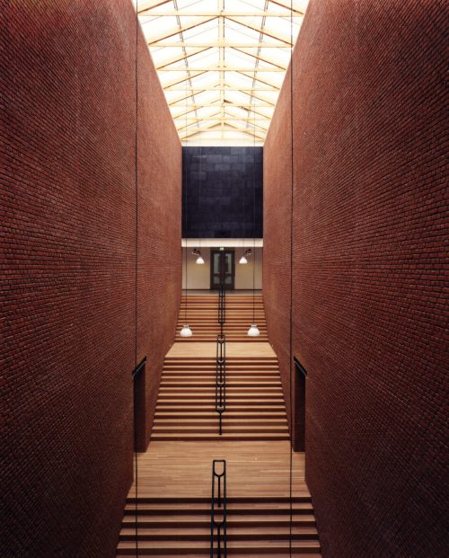 Around 1990 the opportunity arose to build a new building for the Bonnefantenmuseum (Good Children’s Museum). For the realization of a unique construction the institution contacted the Italian architect Aldo Rossi, who was, in the words of Van Grevenstein, director of the museum, “a great expressive inventiveness coupled with a quiet visual language”. The new museum would be a distinctive building that would do justice to the works of art. the best solution for this was an original variation of classical buildings designed for this purpose, a series of galleries, illuminated from the top and sides, in a clearly arranged structure of wings. around a central for Rossi, the museum staircase has demonstrated the importance of public buildings for the identity of the city “… there is a long deck with wood staircase in the building,. this and other features are the very essence of this architecture reminiscent of the seafaring tradition of Dutch cities, like the great river that flows through Europe and through Maastricht… “(Aldo Rossi). Together with her research on typological basis of this building, the architect shaped the idea of some pictures and the text Verlust der Mitte. The cultural philosopher Guido Goossens wrote about the philosophical and symbolic significance of the building in his book ‘Het Bonnefantenmuseum gebouw’ (2007).