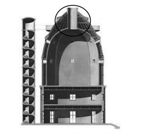 The dome is at one end of the central body, near the river. Zinc coated sheet is bullet shaped and symmetrical. Almost at the tip surrounding a runner outdoors lookouts and has square windows that decrease in size as they approach the top of the dome, the latter being highlighted with small ledges. These types of windows available and resemble those used in the typical buildings of the Dutch countryside.