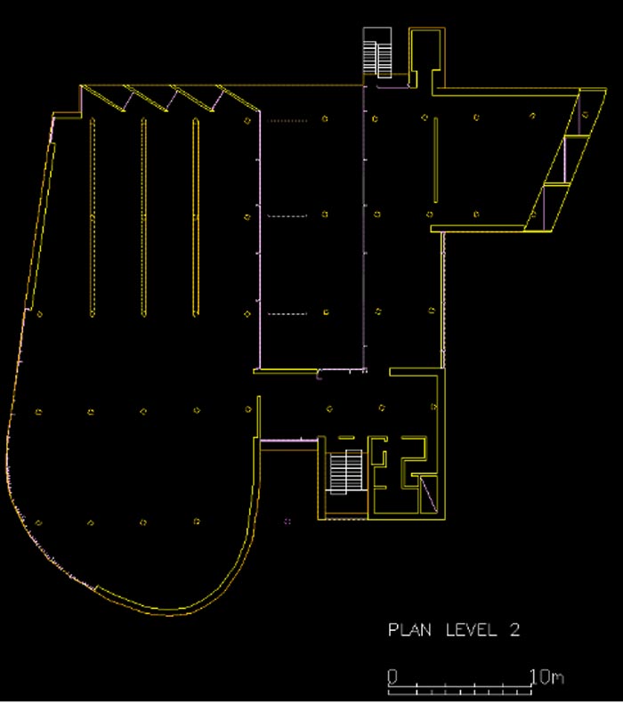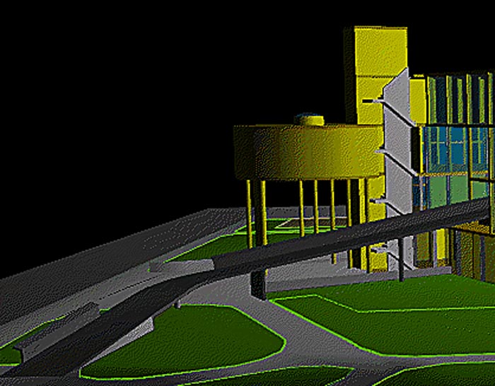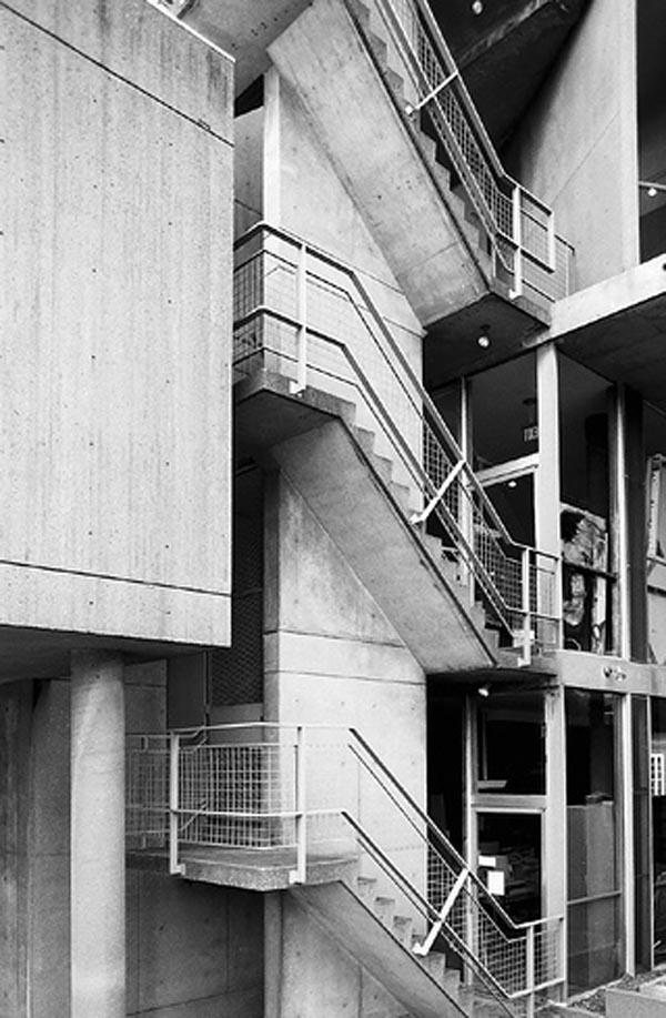 The building can be compared with the Millowners Association Building in Ahmedabad, formed of blocks of various heights in an open plan, wrapped in a marquee and accessible by a ramp-sculpture.