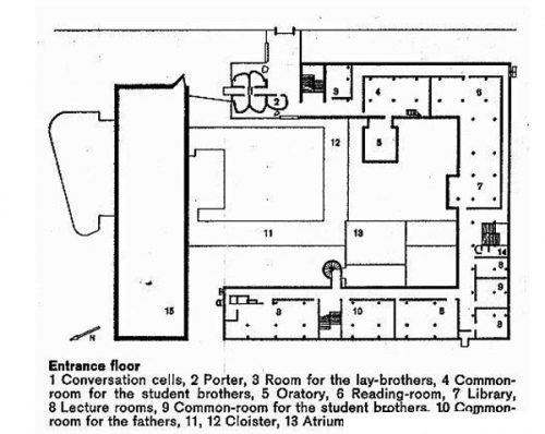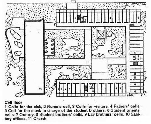 It is a building that needs to be spent on the social, where the formal program and can not be separated without losing its meaning. This is the case of the cloister, a fragment residual and difficult of access on the slope under the monastery and its counterpart on the cover, connecting earth and heaven: a faculty that can not be closed completely to travel, which emphasizes not the presence of God on earth but the barrier, in this case the human horizon, represented by the finest concrete wall that rises above the eye.