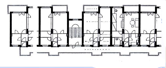 The entire complex so impressed by the consistent and clear, rectangular blocks, low background and various lengths depending on the location on the lot, with glass surfaces, housing, oriented towards the sun and arranged as a series of open houses, at right angles to the street, cross ventilation and ample green areas located between the blocks. With this arrangement and with the same density, room could have more free space, and with a better angle of incidence of the light, a more intense sunny.