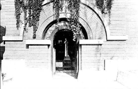 The midpoint of the entrance arch was used by Wright’s work not only in brick and concrete but also in the shape of the interior and exterior doors and the main stack.
