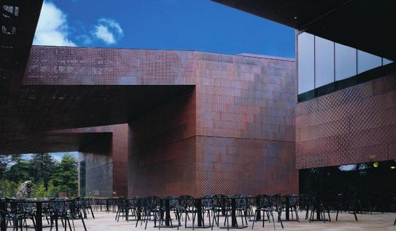 The main entrance is a gap of 9 meters driving through a copper covered walkway to a central courtyard giving access to an elegant living room with Italian sandstone floors where you can access some of the many exhibition halls of the museum. The sophisticated use by architects drawings combined with parallelograms and triangles are obtained spaces full of life and fluidity.