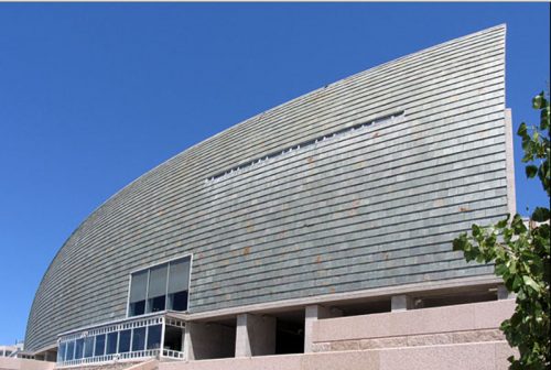 Is resolved through a large curved surface of approximately 94 meters long and 16 tall, short crosoidales curves, geometric expression of continuity and prosperity, and well-defined edges, slightly scaly texture and metallic colors because of the slabs covering the slate, with an image that comes easily to the observer.