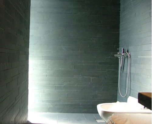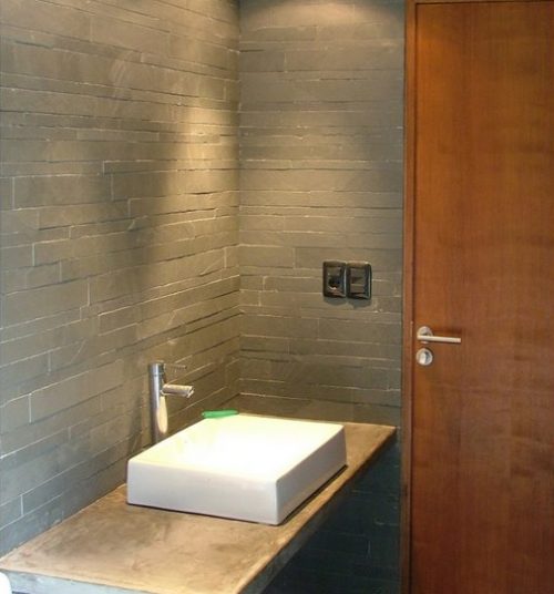 The inner walls were covered with small dark stone tiles contrasting with white plaster ceilings. The premises was combined with the concrete stone in sight.