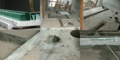In the interior floors combined reddish color of a wood parquet Ibirapitá, native to South America, with the gray cement smoothing and polishing.
