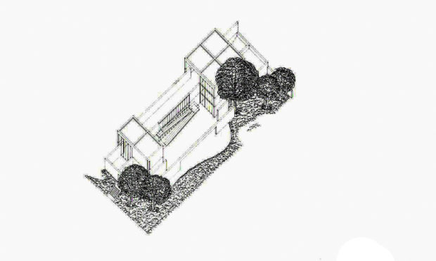 The roofs of the two blocks are flat with gravel on top. In some places the canopy breaks the straight perimeter line to respect the location of the nearest trees.