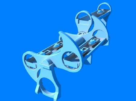 Each drawer operates on small gears that fit into a curved rail and attached to the inside edge of the opening of each arm. In theory this should be sufficient to ensure that it always remains horizontal, but any rubbing or sudden movement could cause the nacelle tilt. To prevent this from happening and ensure that the boats and the water always remain perfectly level throughout the cycle, a series of gears linked act as a backup.