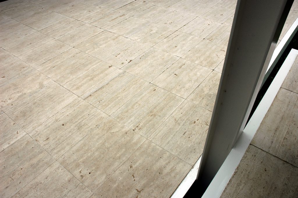 The travertine marble floor was placed in a way that the tiles are not interrupted or perforated, thus creating a smooth transition between the interior and exterior.