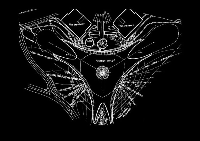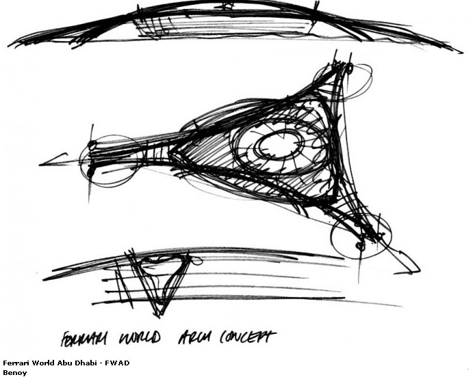 The building was conceived as a simple structure bound to the land. A three-pointed star housing the inner levels, with three claws extending from those points to create the attraction outside of the enclosed space. The outer form of the building was derived from the sinuous double curve of the classic Ferrari bodywork, for which the 3D designs were crucial in the evolution of the structure.