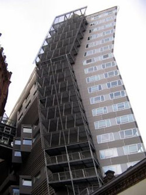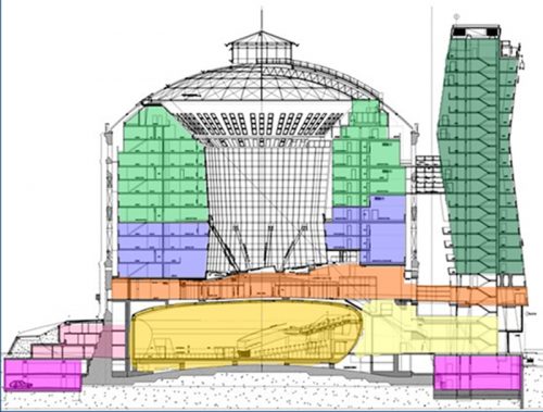- Coop Himmelb(l)au: hypogeum auditorium (3,000 seats), trade area (4,680 sq m) residential area (254 units, plus accommodations for 76 students)
