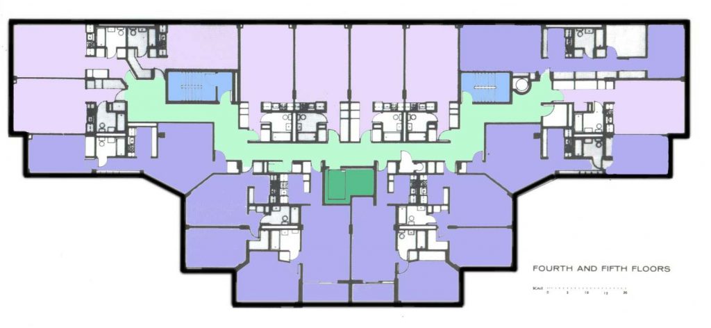 The stepped facade organization allows most units on southwest or southeast facing windows, giving way to sunshine and views of the street below. The open interior corridors were designed to create intimate and informal spaces.