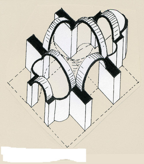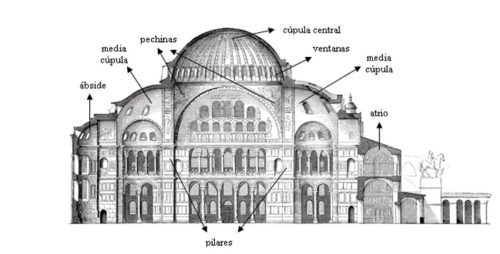 The vaulting of the hemispherical dome center, built on pendentives, arches and pillars angled towards the east and west are developed two hemicúpulas whose pressures are collected by two half-domes. This system expanding domes form the structure of the nave and moves the push from the central dome toward the thick side walls reinforced with buttresses receiving side pressures, from north to south.