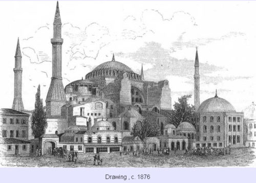 In 1453 Constantinople was taken by the Turks and the Hagia Sophia church converted into a mosque. As a result the minarets rose exterior became interior decoration adding four circular emblems in the corners of the plant, early mosaics were affected losing original splendor and reoriented the temple, which altered the original longitudinal axis plant as the apse of the church was relegated to the background.