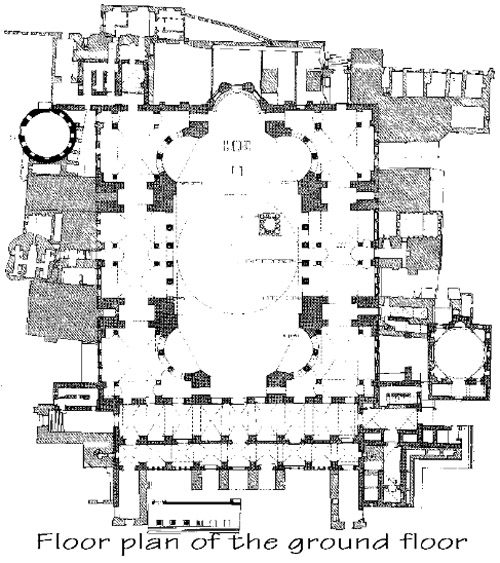 The plant, a box with 70 meters wide and 75 long, located in a square, which faces Jerusalem, east, unifies the Western tradition, central plan and three naves, with the eastern central plant, registered in Greek cross plant and centralizing the design space of the building by a large dome. In this regard it is crucial to study planning and contrarrestos dome, because it helps to emphasize the longitudinal axis while the concept of centralization.