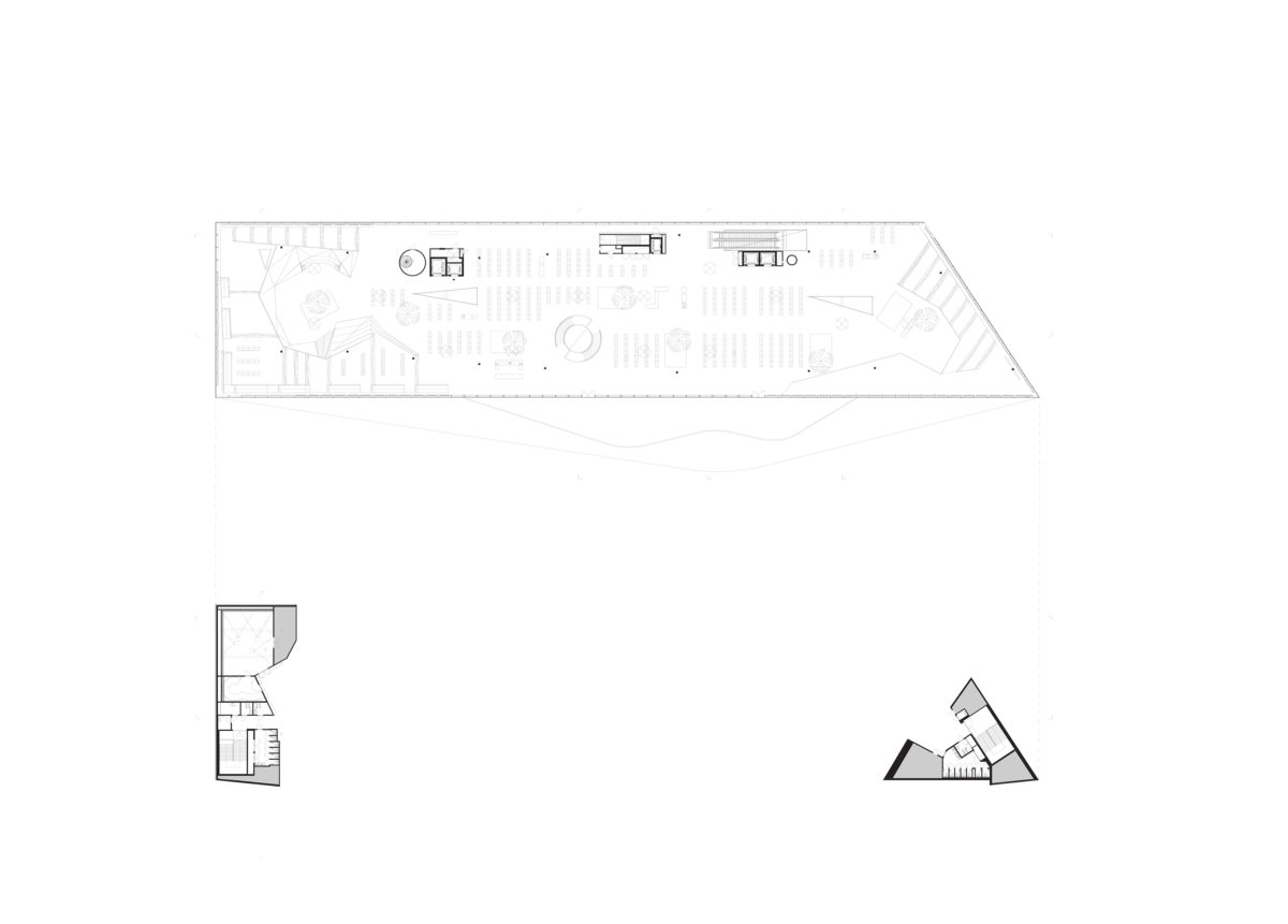 “… The design grows from the dynamics between the site and the objectives of the library program. The key concept is the interaction between the three individual floors of the building. The public square in front of the building continues inside the building, merging with a catalog of meeting and experience features.The ground floor is a robust, busy and freely updated space, suitable for quick visits and tours.The active zero threshold public spaces are visible, attractive, understandable and welcoming to all visitors .