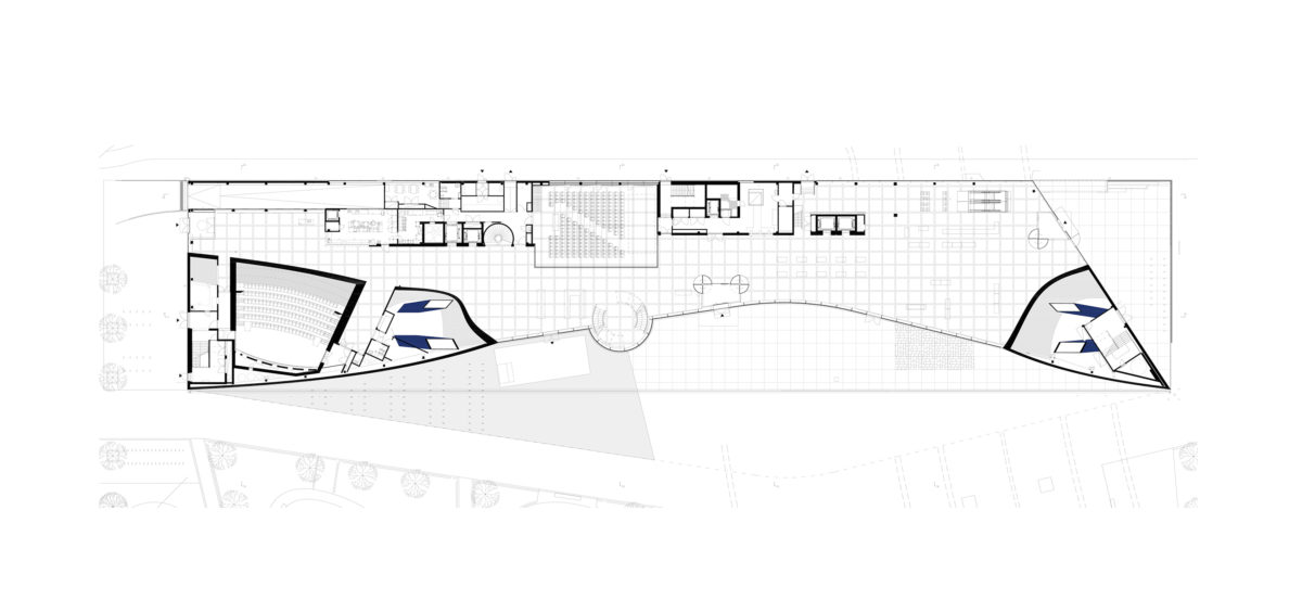 Maintenance and logistics spaces are located in the basement, while administration and storage spaces are kept to a minimum to maximize public access space.