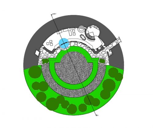 On this floor are the rooms: a main, above the kitchen, and the possibility of creating two, three or four more. The circular portion of which is the interior space has a width of 5 meters and is situated in a radius of 9 meters. Wright space diagram dividing the circle into 60 parts, giving each radio 6 degrees, which require the position of the axes of the beams of the deck and the mezzanine, the trim and the distribution of different elements, fireplace, pond, and cylinder walls.