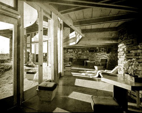The exterior is built with stone from Wisconsin yellowish so pleases Wright.
