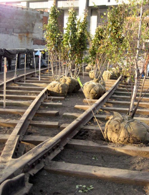 During transfer, each section of the railway was marked and mapped its location to be stored for later to be returned to their place of origin and integrated together with various ornamental plantings.