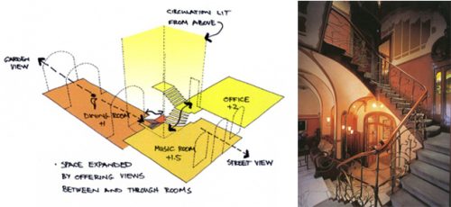 At home Victor Horta shows this inspiration in both architectural details, such as the fine structure that supports the skylight of the ladder, as in the ornate railings, windows, lamps and furniture. The use of materials also denotes the relationship of style and architect with the world of the machine, choosing as material for iron railings, decorative ceilings, skylights, etc.