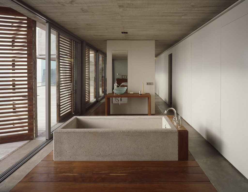 Paralepipédico a module on one floor houses the bedrooms and service spaces and put the volume at low altitude twice in two constituted an L-shaped piece that opens to the south and west directions. Operation rooms (bathrooms and locker rooms) are closed in a box of dry finished walls painted in DM modulated so that they do not identify the doors in this way constitute a single body that serves as a counterpoint to the glass facade that completely da oceanfront are protected and that only through a blind modules practicable ipé wooden facade giving the image of a body and semi-continuous. This resource emphasizes the view from the inside of all rooms, enjoying the changing environment. Some DM lacquered sliding panels or connect the two separate spaces devoted to sleeping areas, allowing the use of both independent and can be accessed from the terrace and they each have a bathroom. While bathing in the first bedroom is located entirely within the service box, the second bedroom located disintegrates a sink and a tub of concrete in the space of the room and the two remaining parts inside the box. The rest of it deals with changing rooms, a bedroom and for the first three interconnected to the second.