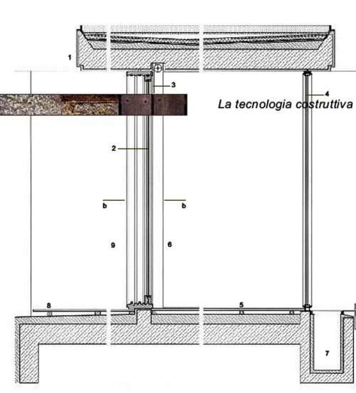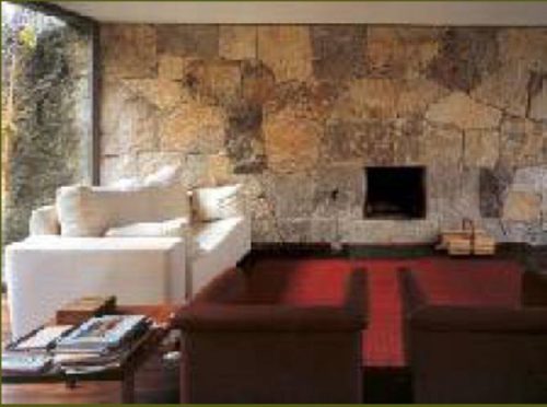 Blind side walls are erected with irregular blocks of granite, are anchored in dry as well as the sides that frame the front glass wall.