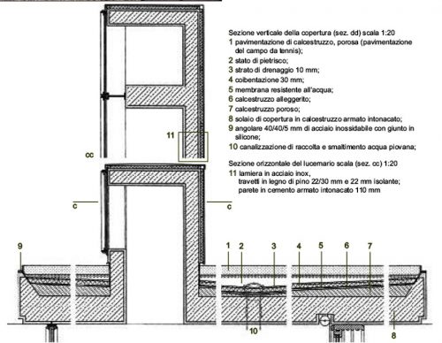 The roof is composed of a porous concrete floor, covered with an insulating layer formed by an impermeable material and a layer of crushed rock. The funnels gutters and water collection are of stainless steel sheet, like the skylights that vent out of it. It also highlights the vent of the chimney which is in the living room.