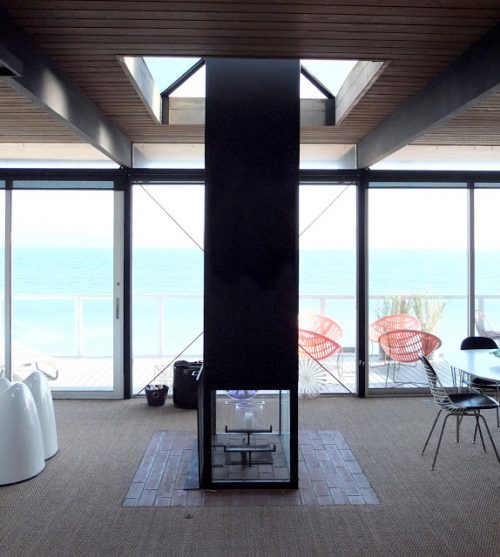 The use of steel for construction of the chimney allowed the removal of a foundation pile. This fireplace is supported by a reinforced concrete pad that rests on a beam. Three of the walls of the combustion chamber are made of Pyrex glass, transparent, the soil was covered with bricks high refractarios.La steel plate is surrounded by a skylight on top of which were placed lights thus the night the fireplace becomes the main source of general lighting in this area. The fireplace is covered with a rotating unit, Ellwood patented, which prevents downdrafts, a fairly common problem in the beach locations.