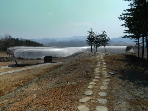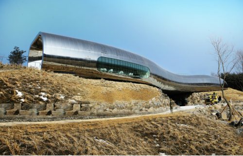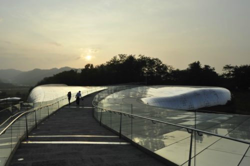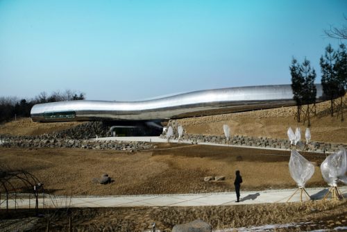 Among the curves and bends of the hills Jeongok, in the region of Gyeonggi-do, South Korea, the volume of this museum is, between two hills and meandering River Hantar. The long, thin Museum flowing around the natural topography.