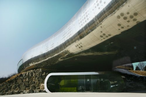Seeking to harmonize with the landscape a building with soft, rounded, biological, almost animal forms projected. Its stainless steel outer skin follows a perforated pattern creates a modern surface inspired snake skins and Korean dragons. At night these holes are on, come alive, the light moves along the surface.